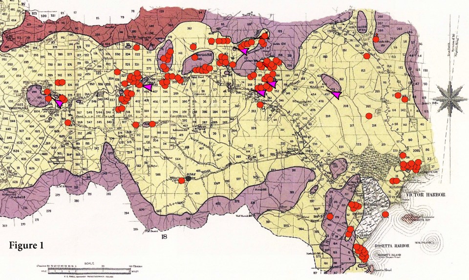 Enhanced map of ‘greater’ Inman River valley by Howchin (1926) showing his locations of erratics (red dots) and striated pavements (with directions of ice movement – purple arrows). Region coloured in yellow was assigned to ‘Permo-Carboniferous glacial’ deposits; other coloured areas are bedrock of various types and ages.