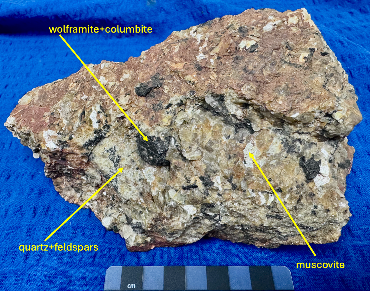 STAFFORD had written a letter to MADIGAN on 16 November 1938 accompanied by rock samples, including this pegmatite, which contains large black crystals of what Stafford thought was wolframite – (Fe,Mn)WO4, an important source of tungsten. The sample came from a hill located 4 miles south of Brooks Soak on the south side of Granite Range. Stafford asked Madigan for his opinion in advance of potentially lodging a claim over the site with the Mining Warden in Alice Springs, in partnership with Madigan. He also commented on a tin prospect in the general area, over which he proposed to peg two claims in partnership with Madigan.